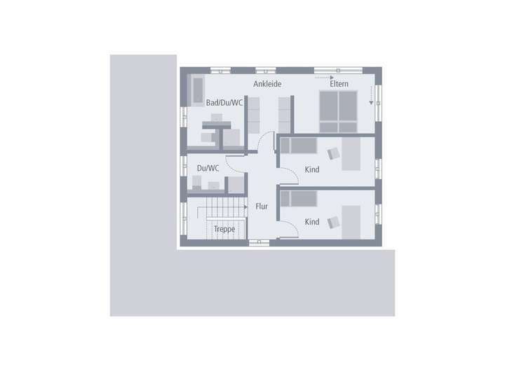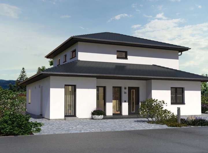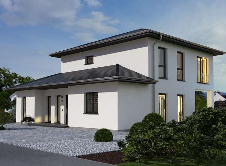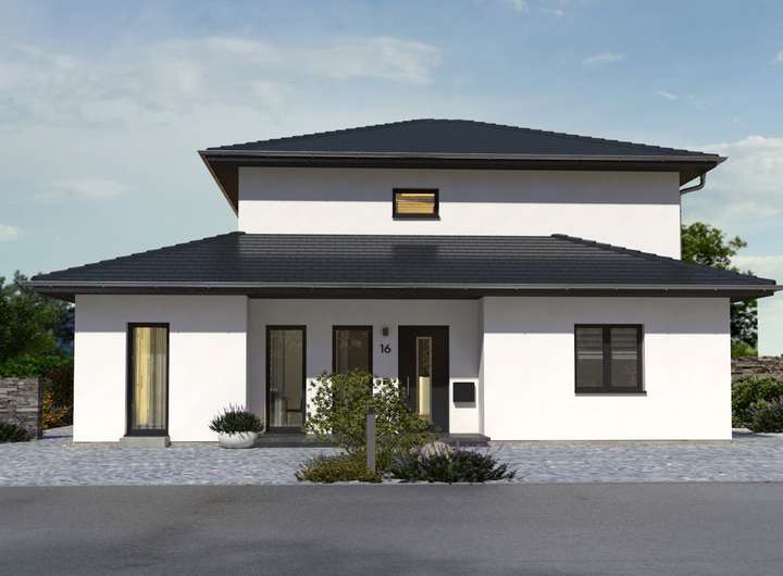 Die Staffelvilla mit Walmdach imponiert mit klarer Struktur. Die reduzierte Formgebung wird architektonisch durch das zweiseitig zurückgestufte Obergeschoss und den Terrassenrücksprung im Erdgeschoss ansprechend ergänzt. Dieser verbindet übergangslos drinnen mit draußen und ist sowohl vom offenen Wohn- als auch vom Essbereich zugänglich. Durch den großzügigen Baustil erhält das Erdgeschoss einen exklusiven Bungalowcharakter. Die halbgewendelte, zentral in den Wohnraum integrierte Treppe führt in die obere Etage. Dort runden der luxuriöse Elternbereich mit Bad en suite, zwei Kinderzimmer sowie ein weiteres Dusch-WC das großzügige Raumangebot ab. OKAL-Standard: ca. 2,80 m Deckenhöhe in beiden Etagen und reichlich Lichteinfall dank bodentiefer Rundum-Verglasung.
