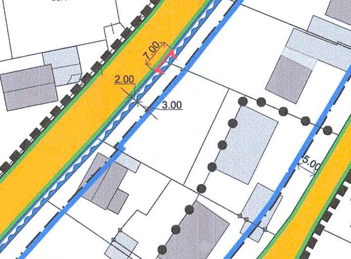 Die Baugrenze liegt ca. 5 m von der Straße entfernt, wovon ca. 2 m durch einen Regenwassergraben gebildet werden. Eine Garage darf in einem Abstand von 6 m zur Straße errichtet werden.