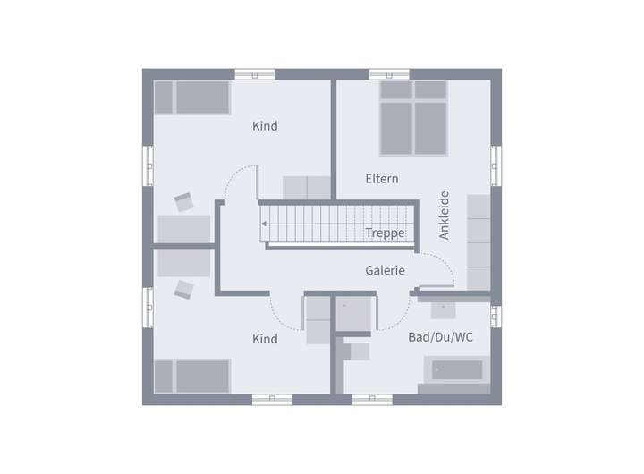 Die Stadtvilla 10.2 mit 135 m² verbindet modernes Wohnen mit einem Gefühl von Zuhause. Im Erdgeschoss öffnet sich der großzügige Wohnbereich - hell, offen und lebendig. Die Treppe steht dabei im Mittelpunkt: Raumtrenner und Gestaltungselement zugleich, das dem Zuhause Charakter verleiht. Hier wird gekocht, gelacht und gelebt. Praktisch ergänzt durch ein Gäste-WC und den Hauswirtschaftsraum, der den Alltag leichter macht. Im Obergeschoss warten Rückzugsorte für die ganze Familie - ein Elternzimmer mit Ankleide, zwei Kinderzimmer voller Ideen und ein Familienbad, das morgens wie abends zum Wohlfühlort wird.