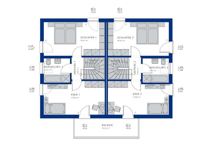 Der Grundriss des CELEBRATION 211 überzeugt durch seine klare und durchdachte Aufteilung. Mit zwei Schlafzimmern pro Wohneinheit schaffen Sie den idealen Raum für Ruhe und Erholung, während der offene Wohn-, Ess- und Küchenbereich ein harmonisches Miteinander fördert. Diese Aufteilung ist perfekt für Familien geeignet, die sowohl Privatsphäre als auch gemeinsame Zeit schätzen. Die beiden Etagen bieten ausreichend Platz und Flexibilität, um individuelle Lebensstile zu unterstützen.