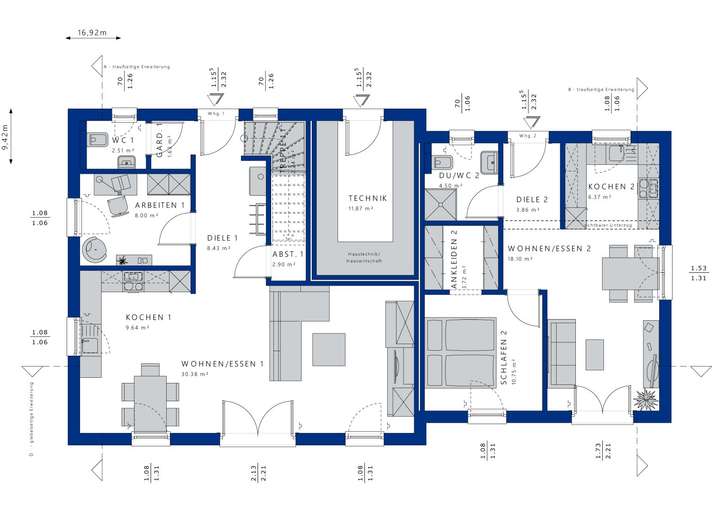Das CELEBRATION 211 ist ein elegantes Zweifamilienhaus, das optimal auf die Bedürfnisse seiner Bewohner ausgerichtet ist. Mit einer Wohnfläche von 134 m² und durchdachten Grundrisslösungen bietet dieses Fertighaus zwei separate Wohneinheiten, die sich ideal für Familien oder als Kombination aus Wohnen und Arbeiten eignen. Jede Wohnung verfügt über zwei Schlafzimmer, die für Ruhe und Rückzug sorgen, während der offene Wohn-, Ess- und Küchenbereich einladend für gemeinsame Stunden ist. Die raumhohen Verglasungen bringen viel Tageslicht ins Innere und schaffen eine freundliche, helle Atmosphäre. Innovative Dachformen und architektonische Details machen das CELEBRATION 211 zu einem echten Blickfang, während die praktischen Technikräume den Komfort erhöhen und den alltäglichen Bedürfnissen gerecht werden.