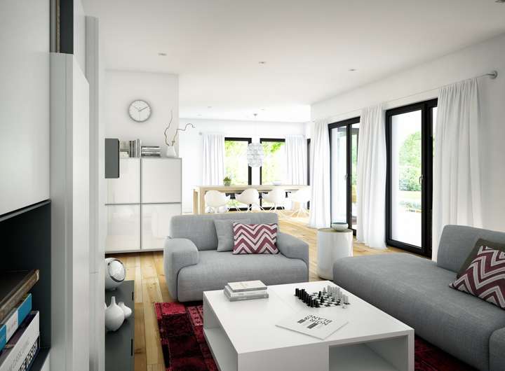 Das EVOLUTION 154 begeistert nicht nur durch seine durchdachte Raumaufteilung, sondern auch durch exklusive Komfortdetails, die das Wohnen zu einem besonderen Erlebnis machen. Die großzügige Terrasse lädt dazu ein, die warmen Sonnenstrahlen zu genießen, während der weitläufige Garten ausreichend Platz für kreative Gestaltungen und entspannende Stunden im Freien bietet. Ob Grillabende mit Freunden oder ruhige Momente im eigenen grünen Paradies - hier finden Sie Ihren persönlichen Rückzugsort. Das lichtdurchflutete Wohn- und Esszimmer schafft eine harmonische Verbindung zwischen Innen- und Außenbereich und lässt Ihnen viel Raum für individuelle Einrichtungsideen und stimmungsvolle Akzente.