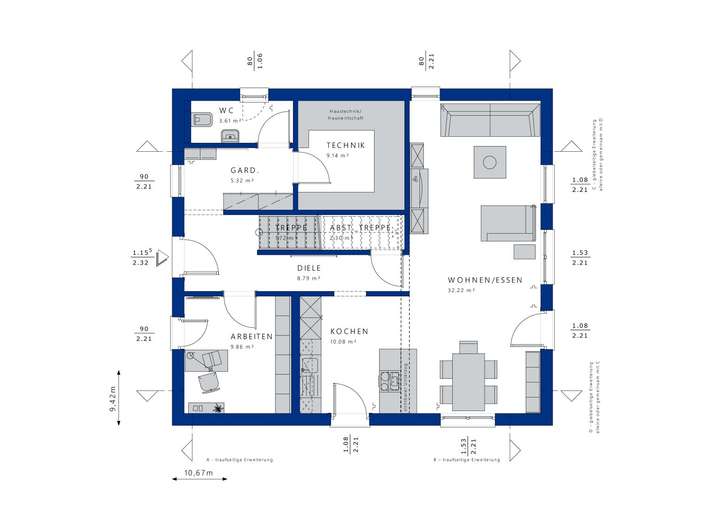 Die Ausbaustufe, die bei diesem Modell gewählt werden kann, ermöglicht Ihnen, den Rohbau und den technischen Innenausbau von Bien-Zenker erledigen zu lassen. Dies bedeutet, dass Sie sich um Böden, Malerarbeiten und Sanitärinstallationen kümmern, während die Kernstruktur bereits fertiggestellt ist. Diese Herangehensweise bietet Ihnen die Freiheit, Ihr Zuhause nach Ihren Vorstellungen zu gestalten, ohne auf die Unterstützung eines erfahrenen Bauunternehmens verzichten zu müssen. Gleichzeitig erfüllt das Haus die Anforderungen des Qualitätssiegels QNG für Nachhaltigkeit, was Ihnen zusätzliche Vorteile in Bezug auf Energieeffizienz und mögliche Förderungen bietet.