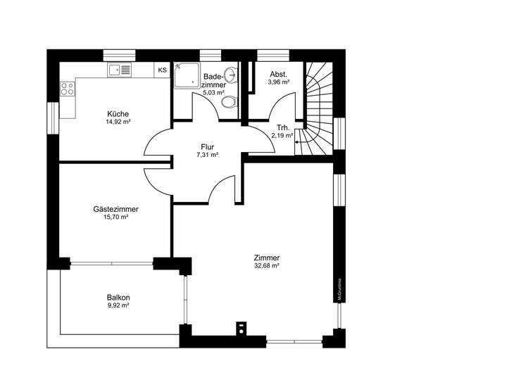 - Aufgeteilt in Wohnraum, Schlafraum, Küche und Bad