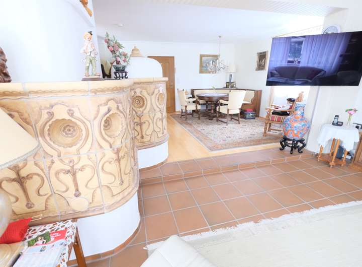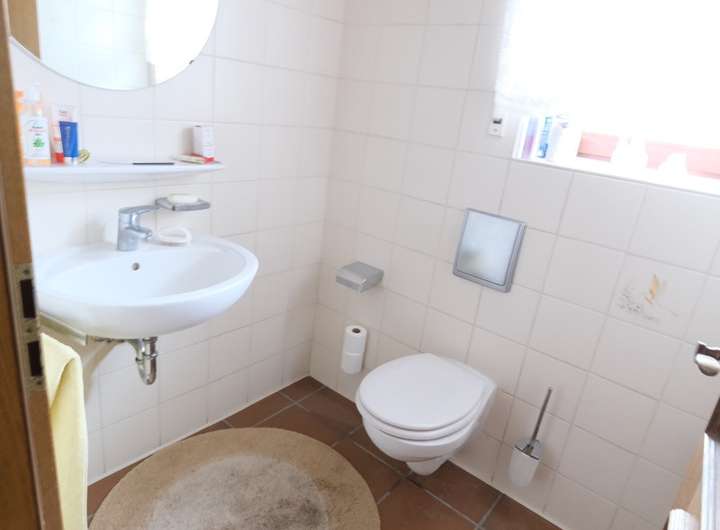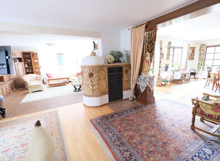 Insgesamt befinden sich auf zwei Stockwerke drei Schlafzimmer, zwei Badezimmer, drei WC, eine Küche und ein großer Essbereich sowie ein offener Wohnbereich mit Kachelofen/Kaminplatz und Terrassenzugang.