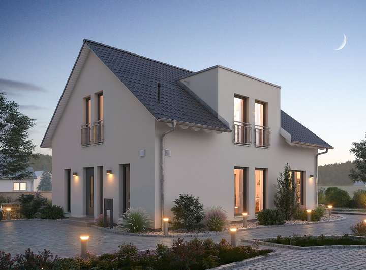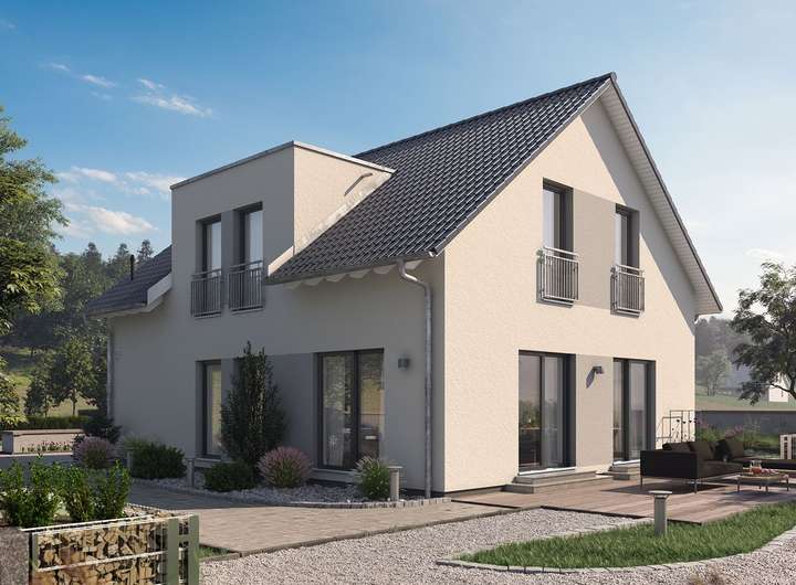 Bodentiefe Verglasungen lassen viel Licht in das Einfamilienhaus und machen das selbstbestimmte Wohnen auf den großflächigen Wohnebenen noch schöner. Weitere Schmuckstücke des Hauses sind der offene, über Eck angelegte Wohn-, Ess- und Küchenbereich oder der gerade Treppenaufgang, der raumsparend zu den großzügigen Zimmern im Dachgeschoss hinaufführt. Die schlichte und dennoch ausdrucksstarke Außenansicht sowie ein klassisches Satteldach prägen den wesentlichen Stil des Hauses.