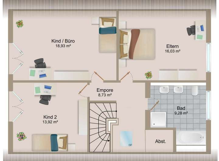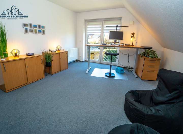 Im Obergeschoss erreichen Sie über eine Empore drei Schlafzimmer, von denen eines aktuell als Büro genutzt wird. In den beiden Kinderzimmern – bzw. dem aktuell als Büro genutzten Raum – sorgen bodentiefe Fenster für viel Tageslicht und flexible Lichtverhältnisse. Die dort verbauten Rollläden verfügen über eine praktische Lüftungsstellung mit zwei Stufen: In der ersten Stufe fährt der Rollladen herunter, lässt jedoch oben eine Öffnung für Licht und Luft. In der zweiten Stufe kann er vollständig geschlossen werden, um eine komplette Verdunkelung zu erreichen. Das Tageslichtbad bietet zusätzlichen Komfort – mit Dusche, Badewanne und zwei Waschbecken.