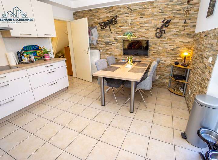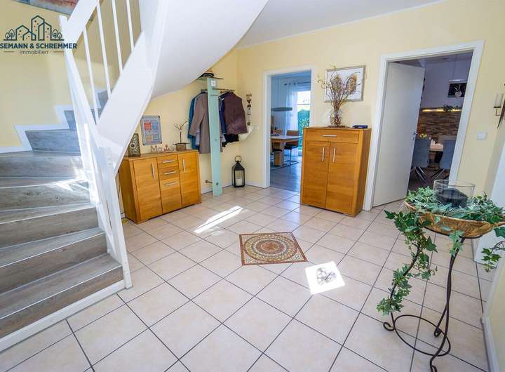 Bereits im Erdgeschoss empfängt Sie eine großzügige Diele, von der alle weiteren Räume direkt abgehen. Die offen gestaltete Küche ist mit einer hochwertigen Nolte-Einbauküche (Baujahr 2021) ausgestattet, bodentiefe Fenster sorgen für ein helles, freundliches Ambiente. Der passende Küchentisch (ohne Stühle) ist im Kaufpreis enthalten. Das großzügige Wohn- und Esszimmer besticht ebenfalls durch große Fensterflächen und schafft eine helle, wohnliche Atmosphäre. Ein Gäste-WC sowie ein praktischer Hauswirtschaftsraum, in dem die gesamte Haustechnik untergebracht ist, komplettieren das Erdgeschoss.