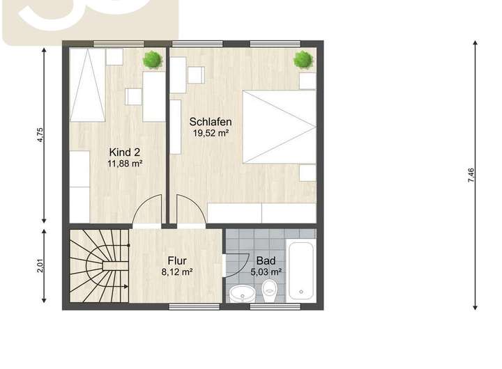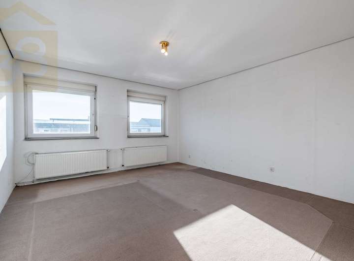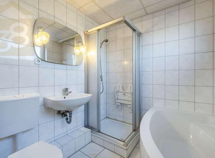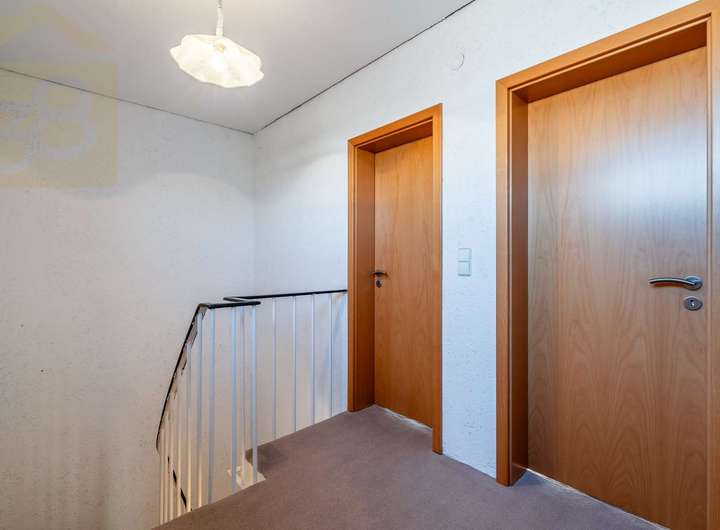Das Obergeschoss ist über einen zentralen Flur erschlossen. Hier befindet sich ein Tageslichtbad mit Fenster, Dusche und Eckbadewanne, das sowohl funktional als auch komfortabel gestaltet ist. Zwei weitere Zimmer stehen zur Verfügung und eignen sich ideal als Schlaf-, Kinder-, Arbeits- oder Gästezimmer.