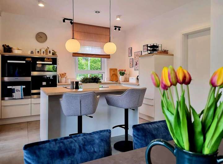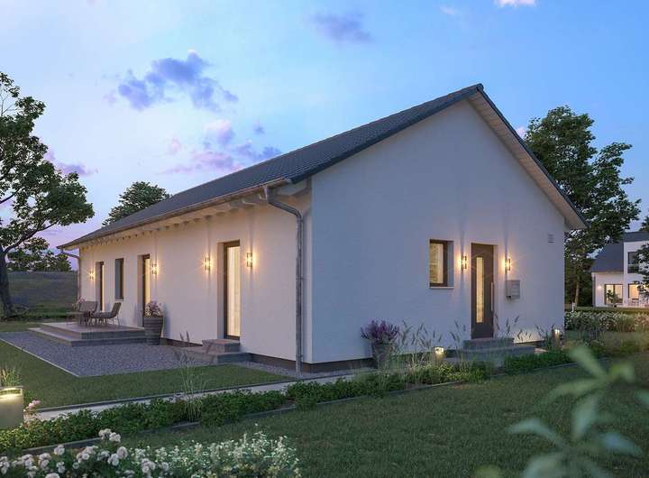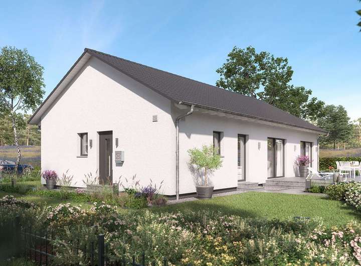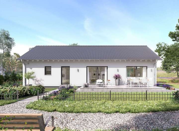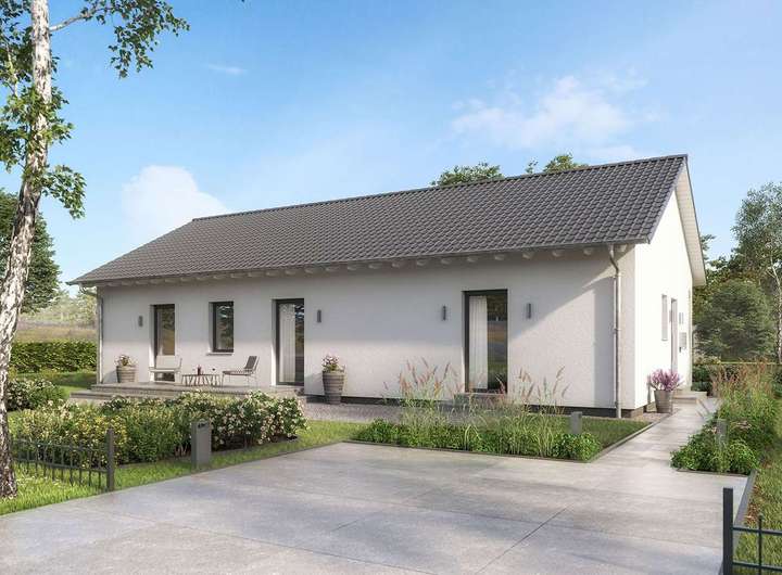 Dieses Haus ist ein Musterbeispiel für eine gelungene Verbindung von Individualität und Funktionalität beim Wohnen. Das Satteldach mit seinen klaren Linien und die bodentiefen Verglasungen im Wohnbereich verleihen dem Bungalow ein attraktives Äußeres, das im Innern mit einem flexiblen, wunsch- und bedarfsgerecht angelegten Grundriss korrespondiert: Auf einer Nettogrundfläche von 118 m² sind der durchdacht und funktional geräumige Wohn-Ess-Bereich mit Gartenanbindung, Küche, Eltern- und Kinderzimmer sowie nützliche Stauraumlösungen realisiert. Serienmäßig höhere Wände unterstreichen das großzügige, individuelle Wohlfühlwohnen und geben kreativen Baufamilien auch auf einer Wohnebene reichlich Raum für kreative Ideen.