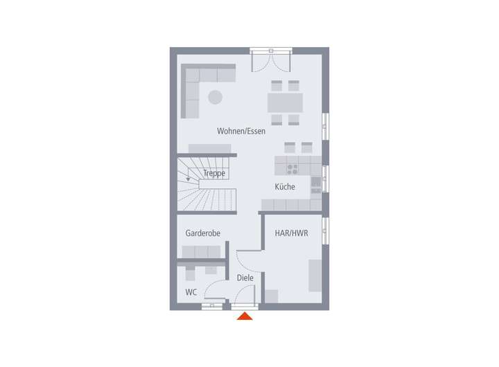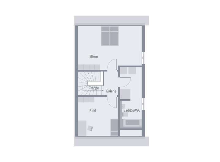 Klein, aber fein - so präsentiert sich unser Doppelhaus 07. Unter dem stilvollen Satteldach befinden sich zwei separate Wohneinheiten, die sich auf zwei Etagen verteilen. Diese bieten ausreichend Platz und Komfort für Singles, Paare oder kleine Familien. Im Erdgeschoss besticht ein großzügig gestalteter Wohn-Ess-Bereich mit einer integrierten Küchenzeile. Von der Küche aus gelangt man direkt in einen großen und praktischen Hauswirtschaftsraum, der zahlreiche Staumöglichkeiten bietet. Ein Gäste-WC und eine Garderobe sind ebenfalls auf dieser Etage vorhanden. Die halbgewendelte Treppe im Eingangsbereich trennt elegant den Nutz- vom Wohnbereich. Im Dachgeschoss stehen den zukünftigen Eigenheimbesitzern etwa 50 m² Wohnfläche zur Verfügung, die dank der durchdachten Raumaufteilung keine Wünsche offenlassen. Das Elternschlafzimmer sowie das Kinderzimmer strahlen durch die Dachschrägen besondere Gemütlichkeit aus und bieten dennoch genügend Platz für Möbel, Erholung, Entspannung und Spiel. Auch auf dieser Ebene befindet sich ein großzügiges Tageslichtbad mit Badewanne, Dusche und WC. Hier gilt: maximaler Wohnkomfort auf kleiner Fläche.