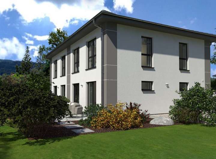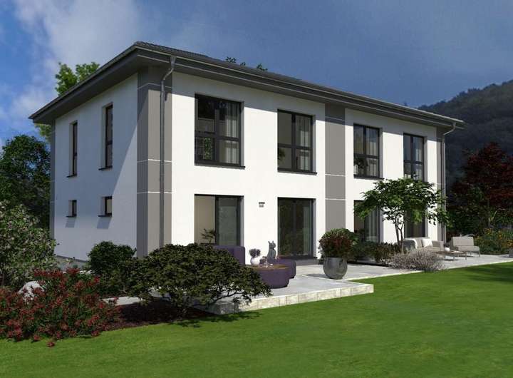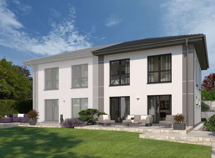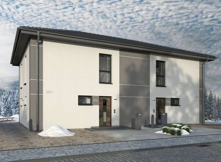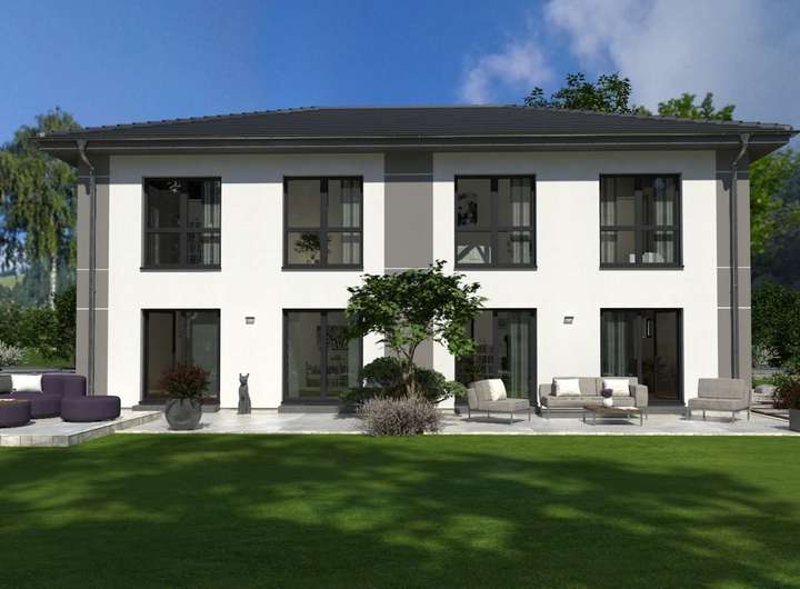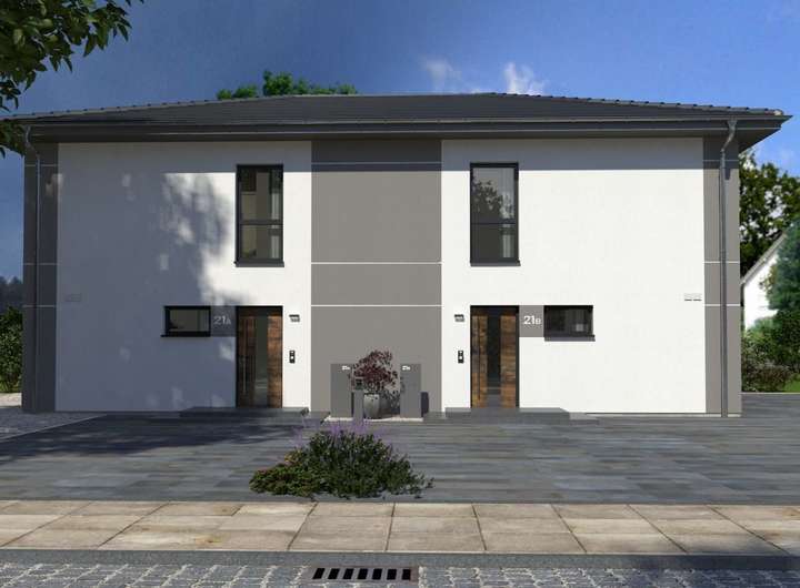Durch seine imposante Größe, das elegante Walmdach und die großzügigen Fensterfronten strahlt unser Doppelhaus 11 eine herrschaftliche Ausstrahlung aus. Bei genauerem Hinsehen wird deutlich, dass es sich um zwei separate Wohneinheiten handelt, die jeweils etwa 142 m² Wohnfläche bieten. Im Erdgeschoss erwartet Sie ein großzügiges Wohn-Ess-Zimmer, das direkt an die Küche anschließt und viel Platz für gemütliche Fernsehabende sowie für die Bewirtung von Gästen bietet. Von hier aus gelangen Sie auch zur Terrasse und in den Garten. Große Fensterfronten sorgen für reichlich Tageslicht. Das Erdgeschoss wird ergänzt durch einen Hauswirtschaftsraum, ein Gäste-WC und eine großzügige Diele mit Garderobe. Eine Treppe führt ins Obergeschoss, wo insgesamt drei Schlafzimmer zur Verfügung stehen: ein Bereich für die Eltern sowie zwei Kinderzimmer. Das Highlight ist das über 13 m² große Badezimmer, das mit Badewanne, Dusche und WC eine wahre Wohlfühloase darstellt.