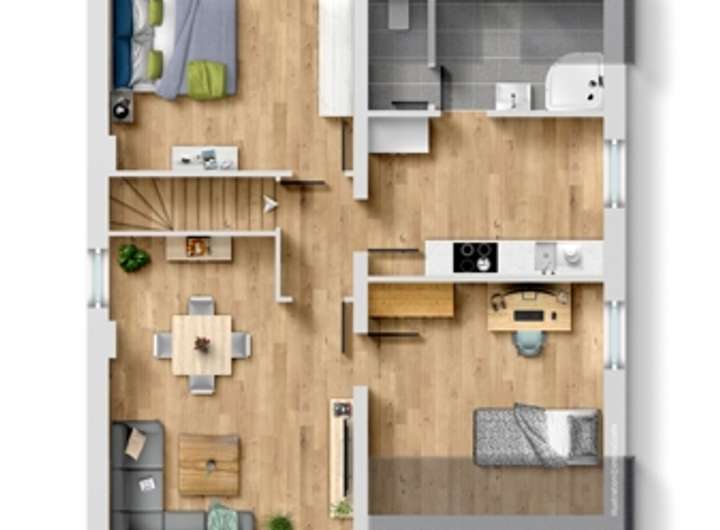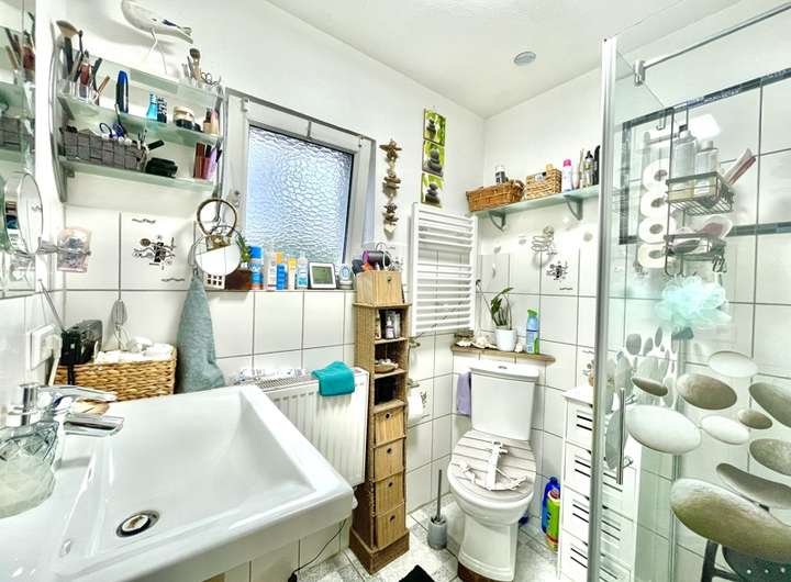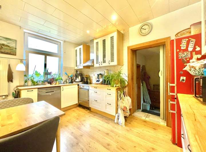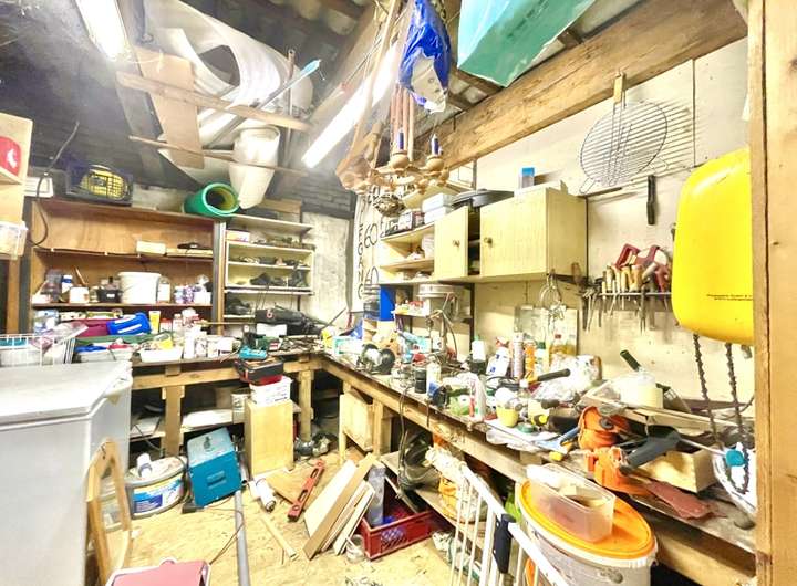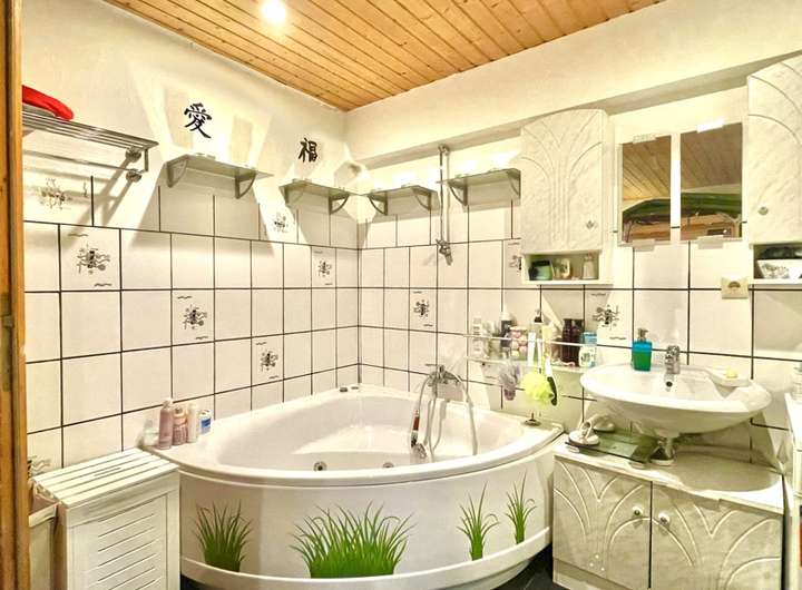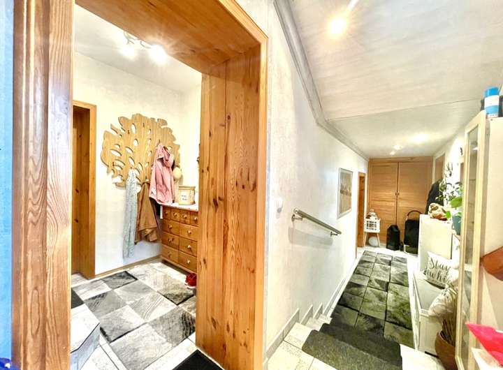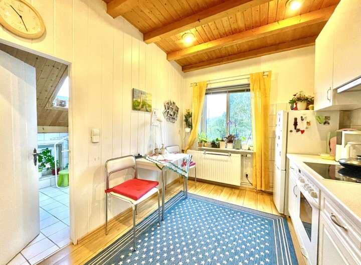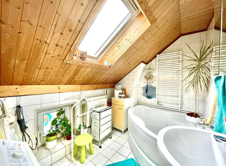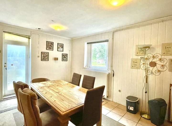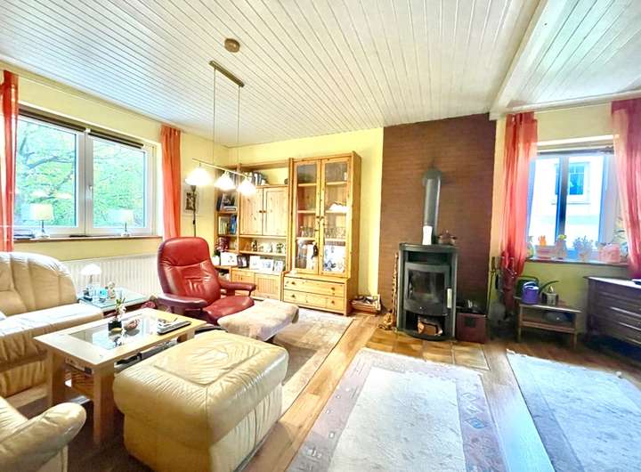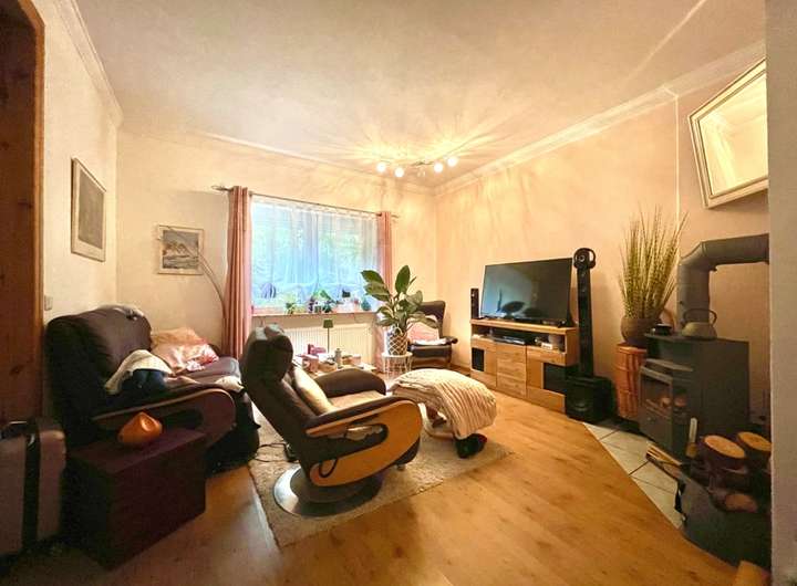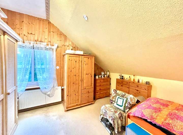 Das Haus wird derzeit von zwei Generationen bewohnt und bietet dank seiner durchdachten Raumaufteilung vielfältige Nutzungsmöglichkeiten. Im Erdgeschoss erwarten Sie ein gemütliches Wohnzimmer mit Kamin, zwei Schlaf- bzw. Kinderzimmer, ein kleines Bad sowie ein großzügiges weiteres Bad im Anbau. Von hier aus gelangen Sie auch in die praktische Werkstatt und in den angrenzenden Partyraum – ideal für Hobbys, Feste oder als zusätzlicher Stauraum. Das Dachgeschoss verfügt über ein helles Wohnzimmer, zwei Schlafzimmer, eine Küche und ein kleines Bad, wodurch sich auch eine separate Nutzung beider Etagen anbietet. Ein Keller ist nicht vorhanden.