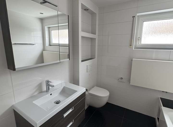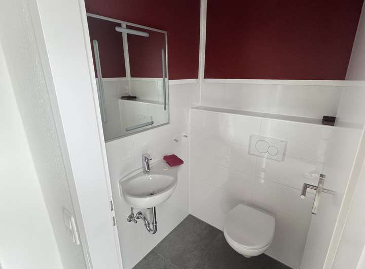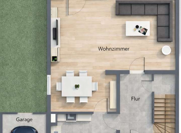 Im Erdgeschoss befinden sich ein großzügiges Wohnzimmer mit Zugang zur Terrasse, eine separate Küche, Diele, Windfang sowie ein Gäste-WC. Die Terrasse erweitert den Wohnbereich nach außen und bietet Platz für entspannte Stunden im Freien.