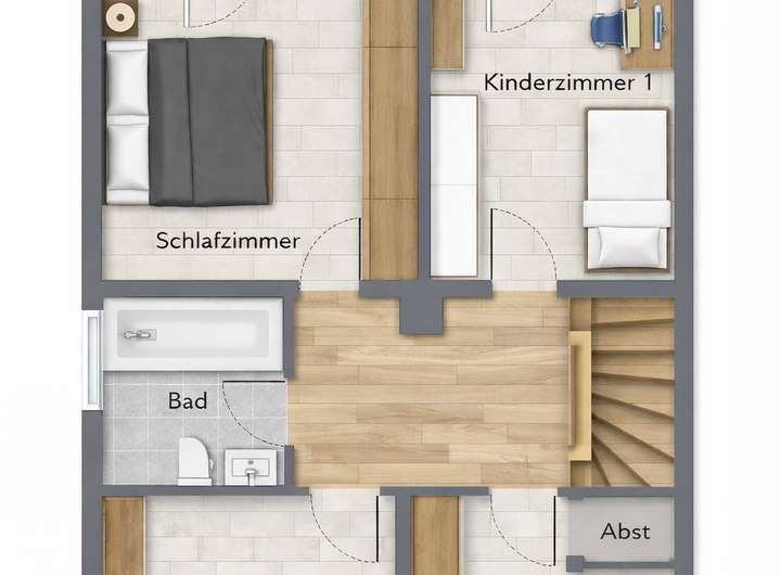 Das Obergeschoss verfügt über insgesamt vier gut geschnittene Zimmer, die flexibel als Schlaf-, Kinder- oder Arbeitszimmer genutzt werden können, sowie ein Badezimmer. Ein Balkon bzw. eine Loggia sorgt für zusätzlichen Außenbezug.