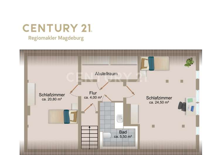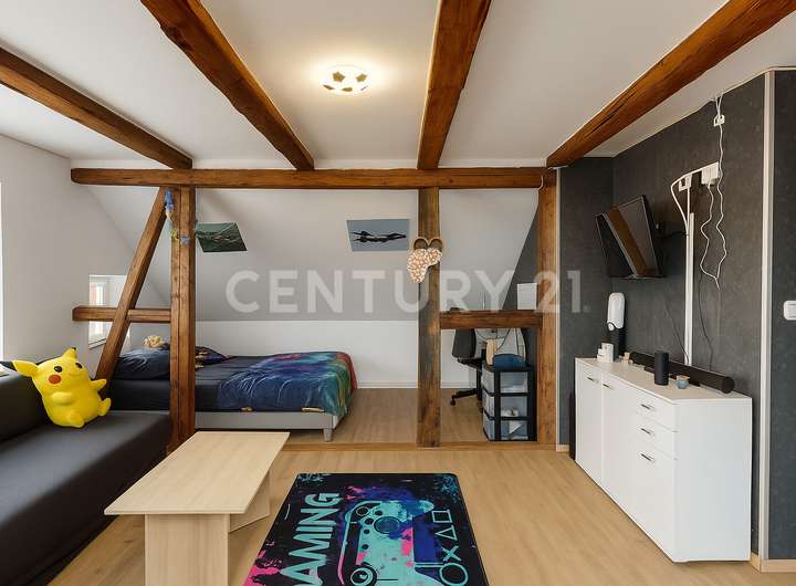 Das Dachgeschoss bietet zusätzlichen Wohnkomfort und eignet sich hervorragend als separater Bereich für Gäste, ältere Kinder oder Homeoffice. Zwei weitere Schlafzimmer schaffen Rückzugsmöglichkeiten mit Charakter. Ergänzt wird die Etage durch ein helles Badezimmer sowie einen praktischen Abstellraum.