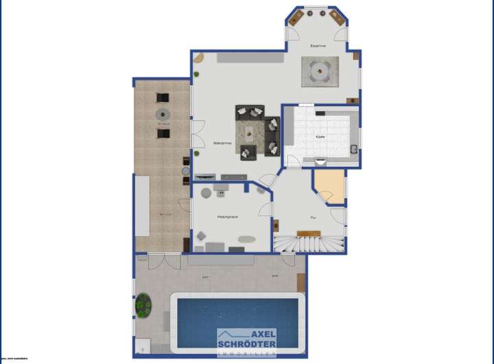 EG: Diele/Treppenhaus, WC, Küche, Wohn-Esszimmer, HWR, Schwimmbad