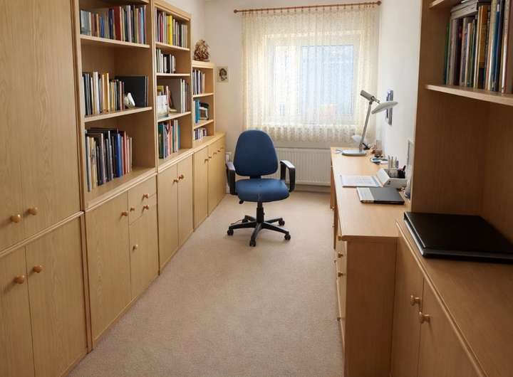 Das 1. Obergeschoss beherbergt zwei gut geschnittene Schlafzimmer, ein Arbeitszimmer sowie ein gefliestes Badezimmer. Alle Räume sind flexibel nutzbar.