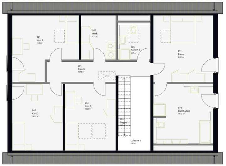 Das FamilyStyle 26.01 S bietet auf einer Nettogrundfläche von 264 m² viel Raum für unterschiedlichste Wohnideen - vom Mehrgenerationenwohnen bis zur vermieteten Einliegerwohnung als Finanzierungshilfe. Möglich macht dies die Aufteilung des Hauses in eine komplette, separate Wohnung im Erdgeschoss - und das eineinhalbgeschossige Wohnen der Bauherrenfamilie, das das Erdgeschoss ausschließlich dem Lebensmittelpunkt im offen angelegten Wohn-, Ess- und Küchenbereich vorbehält. Im Obergeschoss gestatten 127 m² großzügiges Wohnen in drei Kinderzimmern samt eigenem Kinderbad sowie im Elternzimmer mit direkt angegliederter Wellness-Oase.