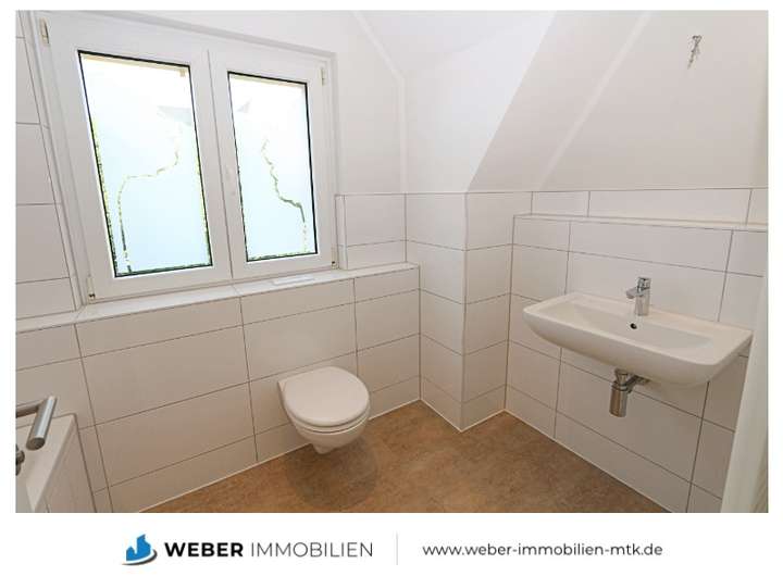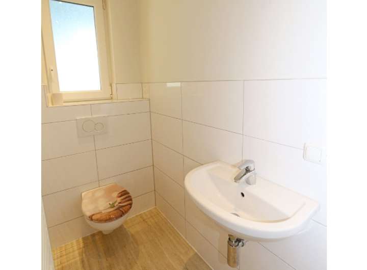 - Tageslicht-Badezimmer / Gäste WC (ca. 3,45 qm) mit WC, Waschtisch und Dusche, Laminat