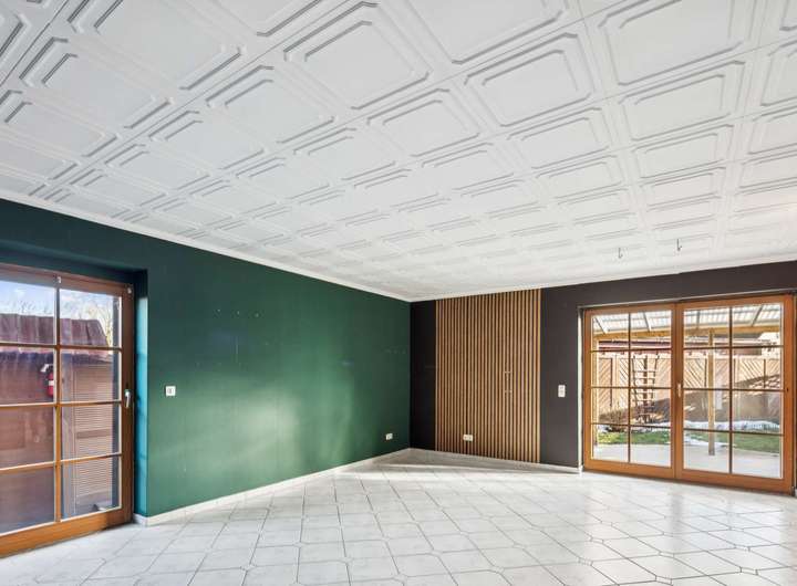 Das Herzstück des Hauses bildet das großzügige Wohnzimmer. Dank der großen Fensterfront und der Terrassentür ist der Raum lichtdurchflutet und schafft eine freundliche, offene Wohnatmosphäre. Hier finden sowohl eine gemütliche Wohnlandschaft als auch zusätzliche Möbel problemlos Platz. Die hellen, pflegeleichten Bodenfliesen sowie die Fußbodenheizung sorgen für zeitgemäßen Wohnkomfort. Auch die angrenzende Küche ist mit einer Fußbodenheizung ausgestattet und lädt zum gemeinsamen Kochen und Verweilen ein.