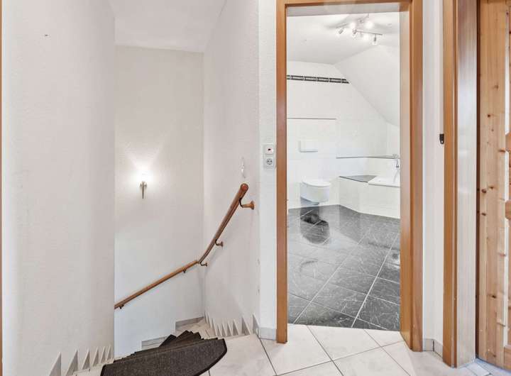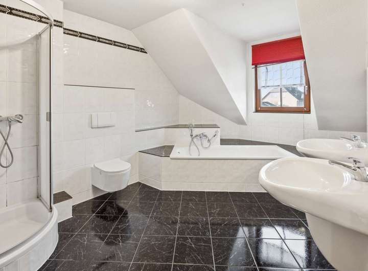 Das moderne Badezimmer überzeugt mit einer hochwertigen Ausstattung: Dusche, Waschbecken, Eckbadewanne und Hänge-WC fügen sich harmonisch in das zeitlose Design aus hellen Keramiken und eleganten Wand- und Bodenfliesen ein. Eine Fußbodenheizung sorgt auch hier für angenehme Wärme und zusätzlichen Komfort.