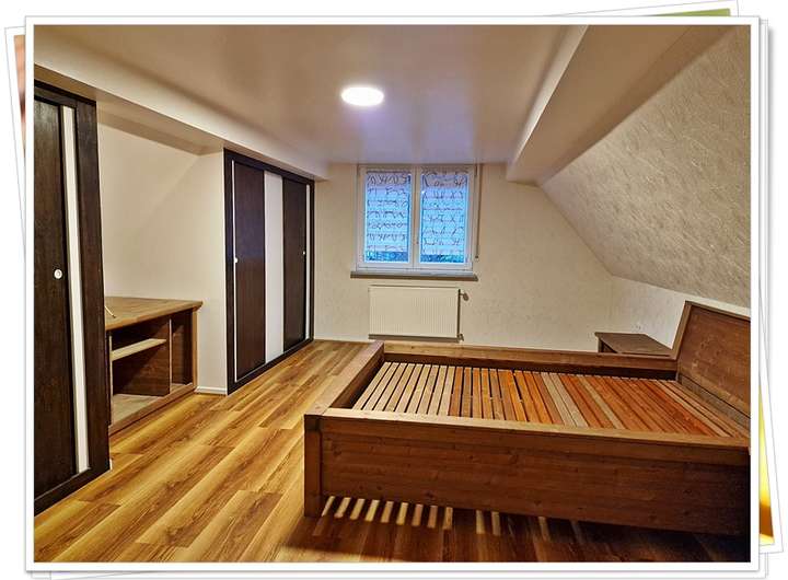 Im DG liegt rechte Seite das Schlafzimmer mit Einbauten versehen und ein handgefertigtes Bett.