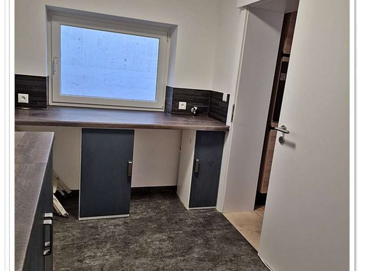 Im Erdgeschoss liegt die Küche mit Essbereich, die Küche ist bereits mit einer Einbauküche versehen. Die Küche bildet hier die Verbindung zwischen Flurbereich und Hauswirtschaftsraum, sowie Hofausgang und Kellerabgang.