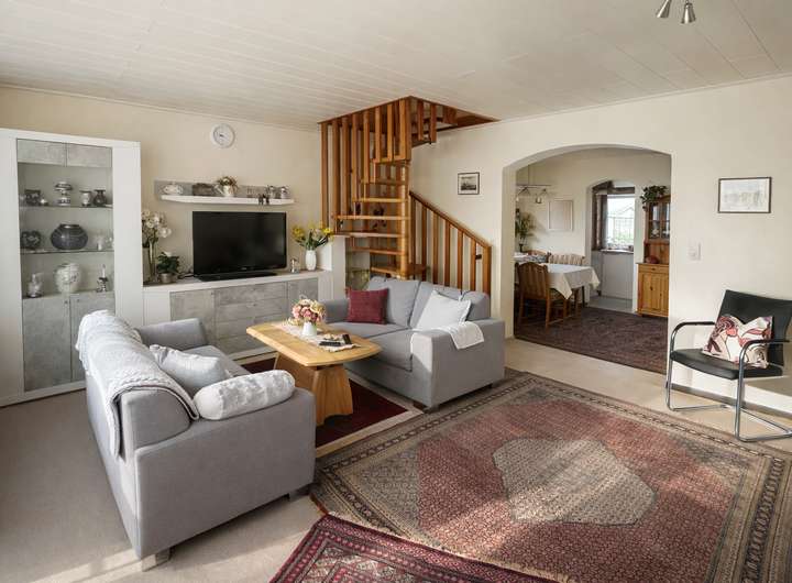 Das 1. Obergeschoss verfügt über eine Wohnfläche von ca. 50 m² und bildet den zentralen Wohnbereich des Hauses. Die Räume sind funktional geschnitten und bieten eine angenehme Wohnatmosphäre mit Ausblick ins Grüne und auf den Rhein. Durch die Lage im Obergeschoss ist ein hohes Maß an Ruhe und Privatsphäre gegeben.
