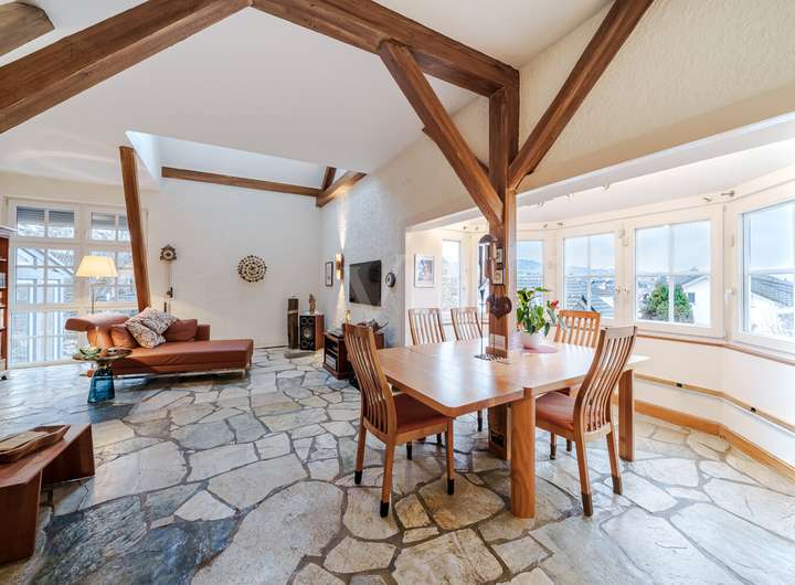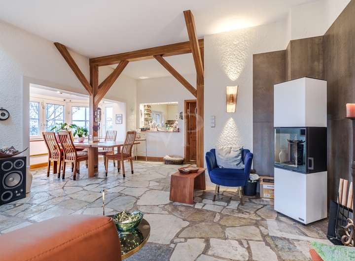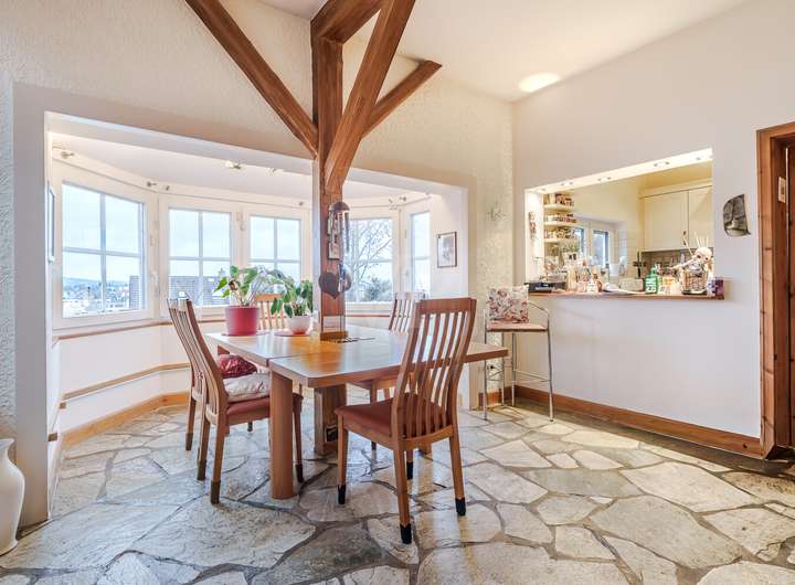 Außerdem verfügt das Haus im Wohn-Essbereich über einen modernen behaglichen Kaminofen sowie einen charmanten Erker mit Essplatz - der Fernblick ist hier inklusive!