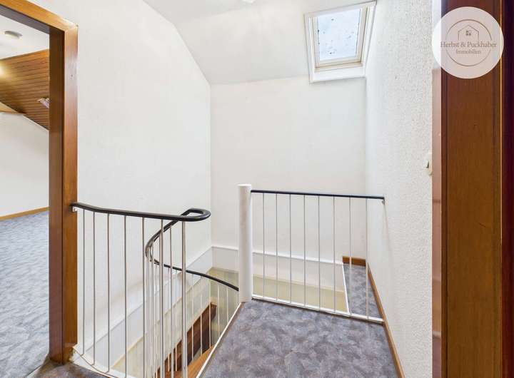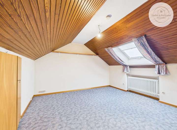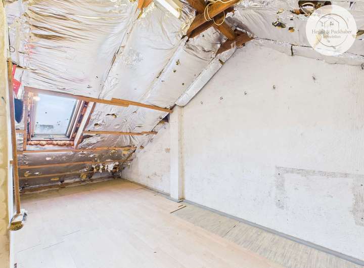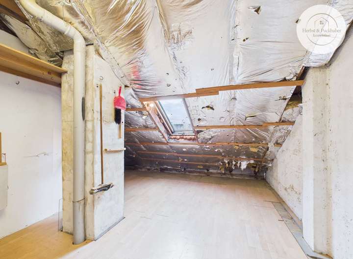 Eine Wendeltreppe mit Holzstufen führt in das Dachgeschoss. Dieser Bereich verfügt bereits über ein weiteres Zimmer. Zusätzlich besteht die Möglichkeit, den Dachraum weiter auszubauen und so zusätzliche Wohnfläche zu schaffen.