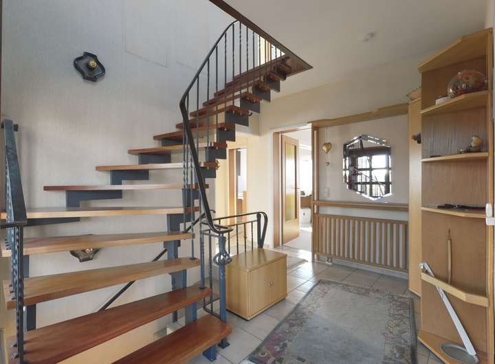 Praktisch ist auch der Teilkeller mit drei Kellerräumen – ideal für Vorräte, Hobby oder Stauraum. Bei den Bodenbelägen wechseln sich Fliesen und Teppich ab. Die Fenster sind aus Kunststoff und Holz.