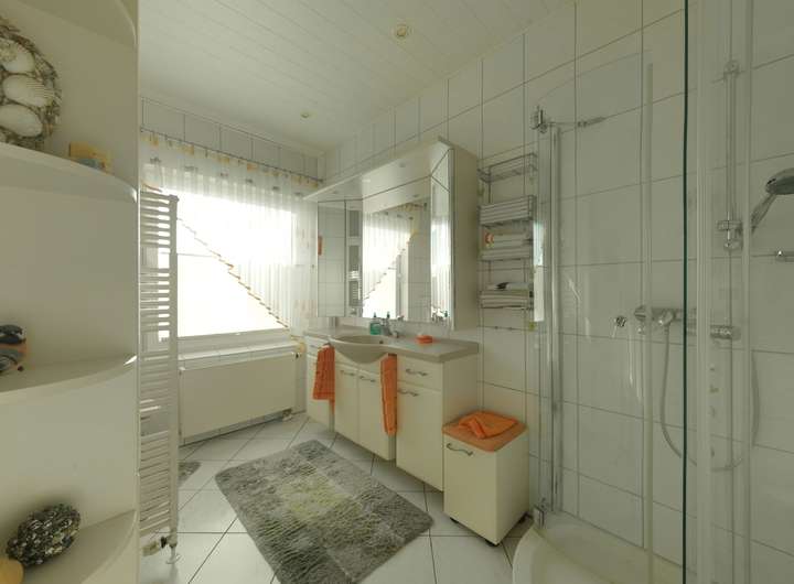 Im Obergeschoss setzt sich das großzügige Raumangebot fort: Zwei Kinderzimmer sowie zwei sehr große Schlafzimmer bieten vielfältige Nutzungsmöglichkeiten. Ein weiteres Badezimmer mit Wanne und Dusche rundet diese Etage alltagstauglich ab.