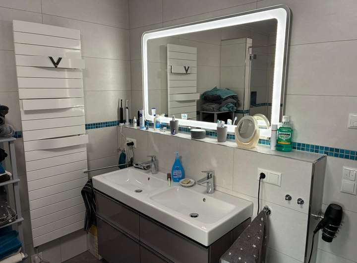 Die Duschen sind begehbar. Die Badewanne ist mit Sprudeldüsen und integrierter LED-Beleuchtung standardgemäß ausgestattet.