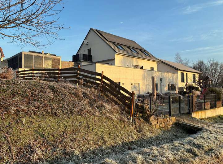 Dieses Haus überzeugt durch seine moderne, durchdachte Bauweise: Man kann es auch als Mehrgenerationenhaus sehen, weil die Wohnung für die ältere Generation mit einem Fahrstuhl ins Untergeschoss, das seniorengerecht ausgebaut ist, führt. Der Zugang zu beiden Wohneinheiten ist barrierefrei, die Türrahmen im Untergeschoss sind 1 m breit. Im Erd- und Dachgeschoss findet eine Familie mit Kindern auf zwei Etagen ideale Voraussetzungen zum Wohnen, Spielen, Lernen und Arbeiten im Homeoffice. Ein Glasfaseranschluss ist bereits vorhanden.