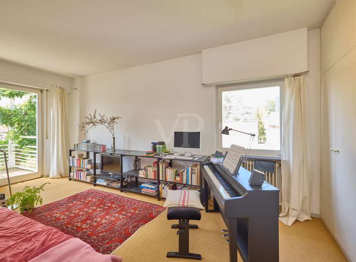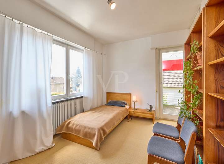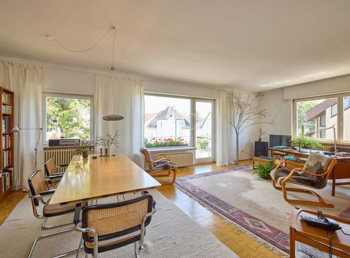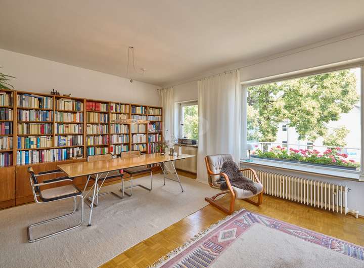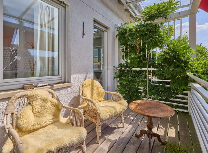 Das großzügige und helle Wohn-/Esszimmer mit Zugang zum Ostbalkon, das Tageslicht-Bad mit Dusche sowie die geräumige Küche. Der nachträglich errichtete, eingewachsene Balkon nach Westen ist von den beiden ansprechenden Schlafzimmern begehbar.