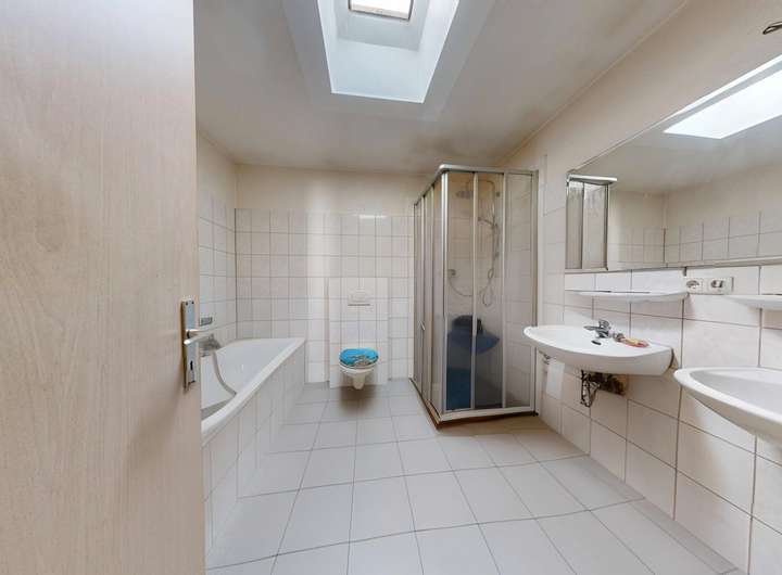 Die erste Wohneinheit bietet rund 109 m² Wohnfläche. Sie verfügt über vier flexibel nutzbare Zimmer, eine Küche, ein Badezimmer sowie einen Abstellraum. Die Aufteilung eignet sich sowohl für Familien als auch für Personen mit Bedarf an Arbeits- oder Hobbyräumen.