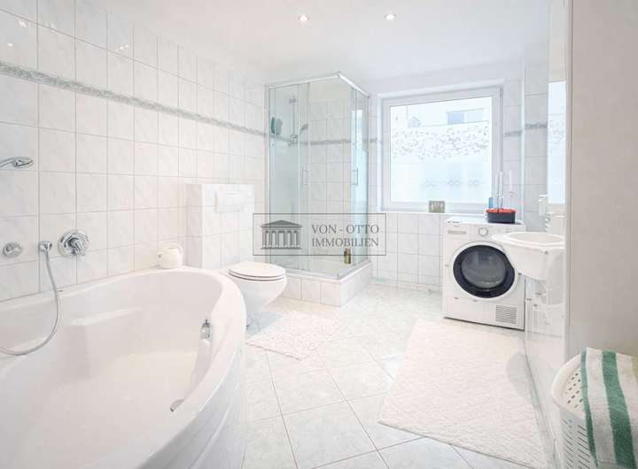 Das hochwertig ausgestattete Badezimmer wird zur persönlichen Wohlfühloase: Entspannen Sie in der luxuriösen Whirlpoolwanne oder genießen Sie den Komfort der separaten Dusche - hier beginnt und endet jeder Tag mit einem Hauch von Wellness.