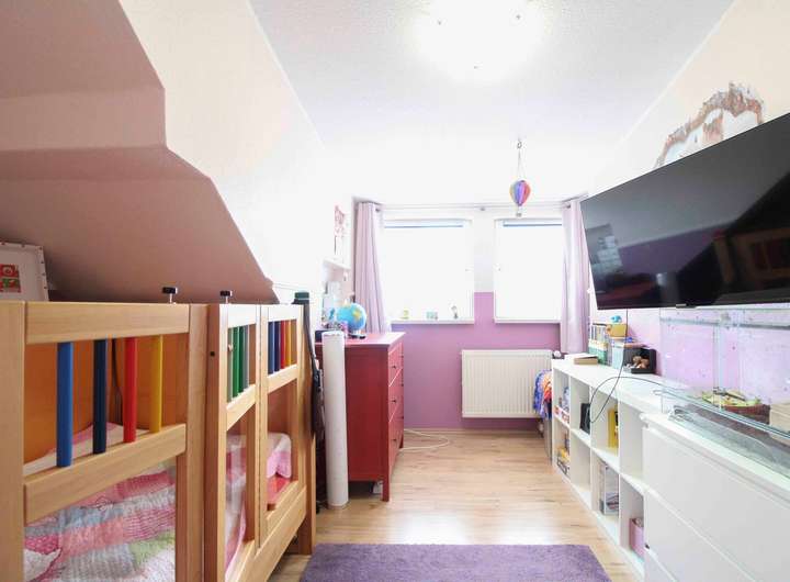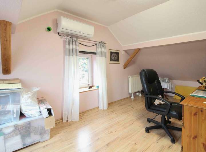 Über die Treppe gelangen Sie in das ausgebaute Dachgeschoss, das im Jahr 2012 durch eine Dachdämmung und den Ausbau einer Dachgaube zusätzlichen Wohnraum erhielt. Die neuen Dachfenster sind mit solarbetriebenen Jalousien ausgestattet und eine Klimaanlage sorgt im Sommer für angenehme Temperaturen – ein echtes Komfort-Highlight!