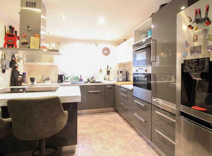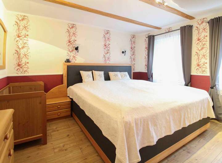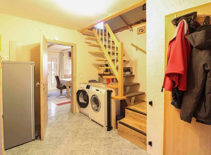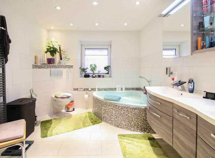 Auf rund 140 m² Wohnfläche verteilen sich 6 helle Zimmer, darunter drei Schlafzimmer, zwei moderne Bäder sowie ein großzügiger Eingangs- und Wohnbereich mit Kaminofen. In der Küche erwartet Sie eine moderne Einbauküche mit Kochinsel. Das Bad im Erdgeschoss ist mit einer Fußbodenheizung ausgestattet und wurde, wie das obere Bad, in den letzten zehn Jahren komplett erneuert.