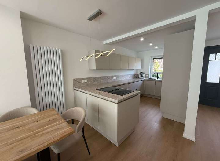 Im Erdgeschoss befindet sich das Herzstück des Hauses: der lichtdurchflutete Wohn- und Essbereich mit offenem Ambiente und großem Fenster zur Gartenseite. Die neue, hochwertige Einbauküche mit modernen und hochwertigen Markengeräten fügt sich harmonisch ein und macht Kochen zum Genuss.