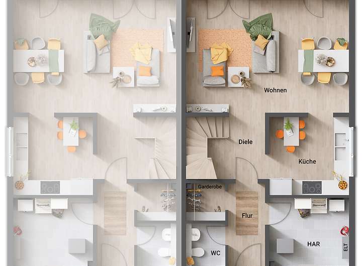 Hier kann man leben und sich wohlfühlen - im Doppelhaus Duett 125 fehlt es an nichts! Ein offener, heller Wohn- und Essbereich ist der Mittelpunkt des Hauses. Hier trifft sich die Familie zum gemeinsamen Frühstücken oder für gemütliche TV-Abende. Auch in der geräumigen Küche gibt es eine kleine Essecke, von der aus beim Kochen zugeschaut werden kann. Ein Highlight ist der separate Garderobenbereich, der im Flur für Ordnung sorgt.