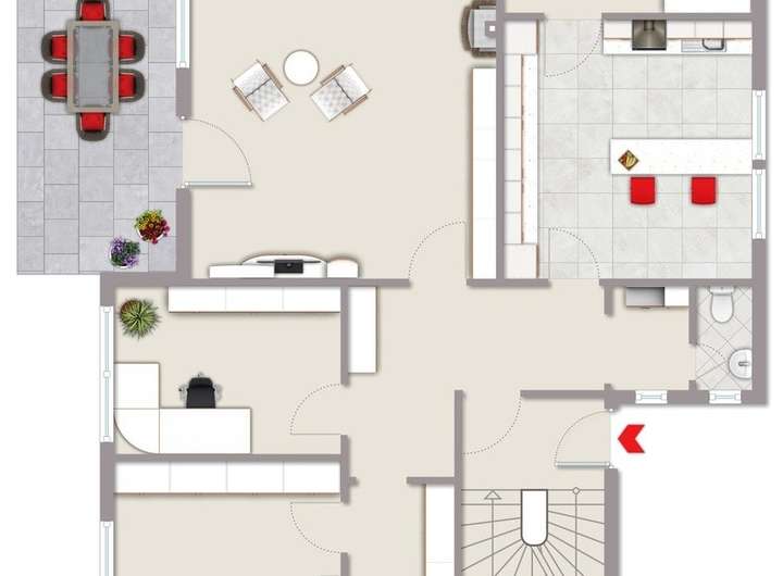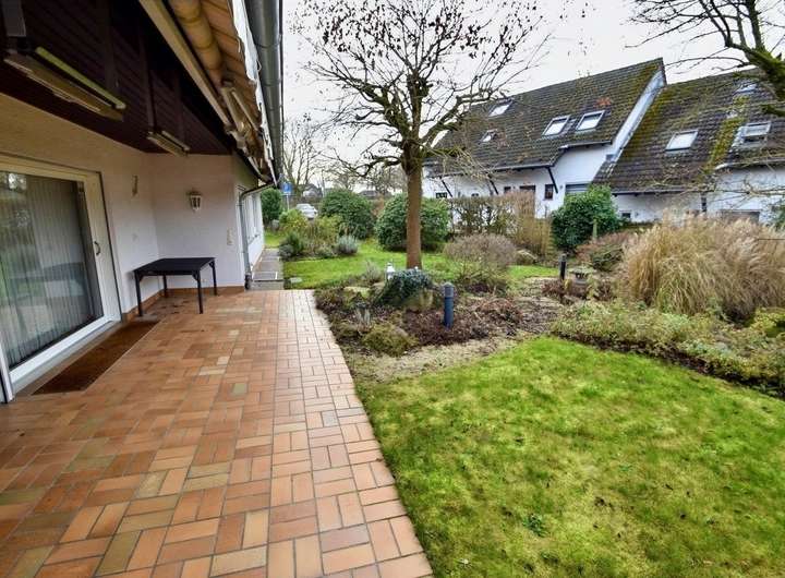 Erdgeschoss mit Büro/Gästezimmer, Diele, Gäste‑WC, Schlafzimmer, Küche, Essbereich, großem Wohn‑/Esszimmer mit Zugang zur Terrasse und zum Garten, Tageslichtbad mit Badewanne.