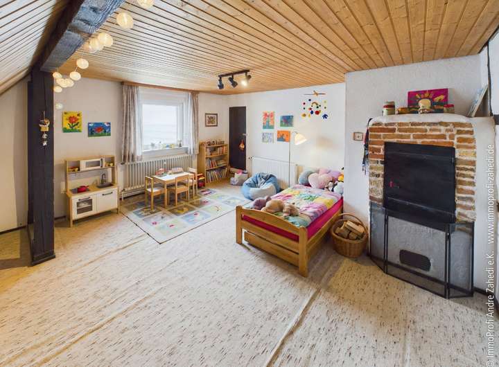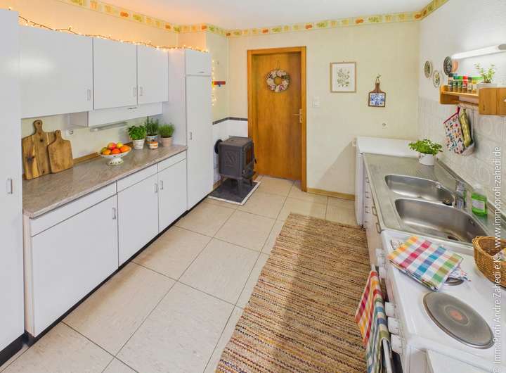 Neben dem Wohnhaus bietet die Hofreite viel Nutzraum: ca. 50 m² Kellerfläche sowie rund 100 m² Nutzfläche im Seitenanbau, der früher als Stallung diente – ideal für Werkstatt, Hobby, Lager oder alles, was eine Familie so mitbringt. In der Küche sorgt ein kleiner Werkstattkamin für eine gemütliche Note und eine Extraportion Atmosphäre.