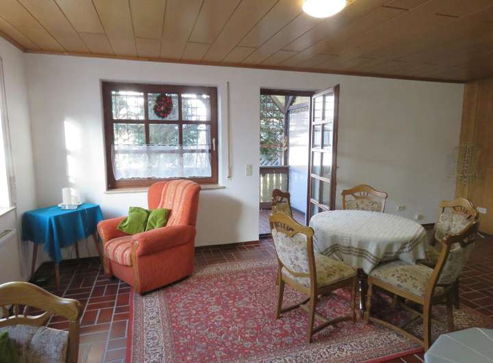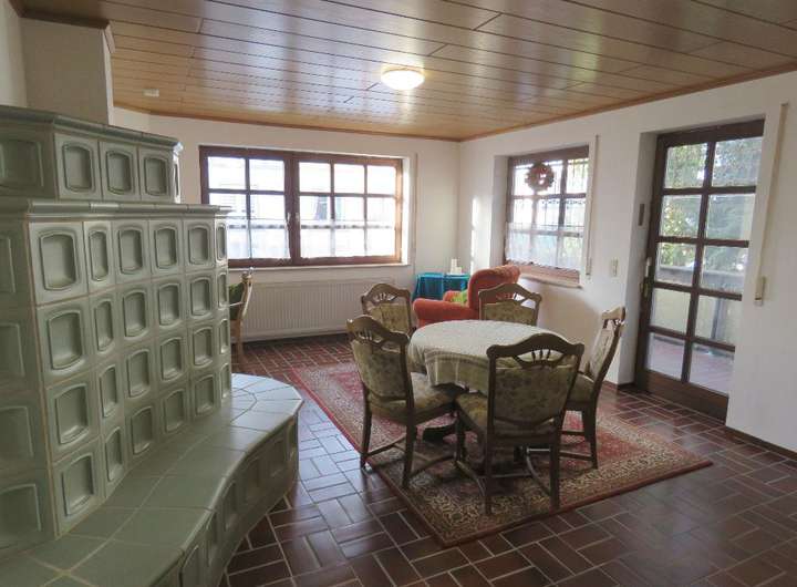 großes Wohnzimmer mit Kachelofen, Ausgang zur überdachten Terrasse
