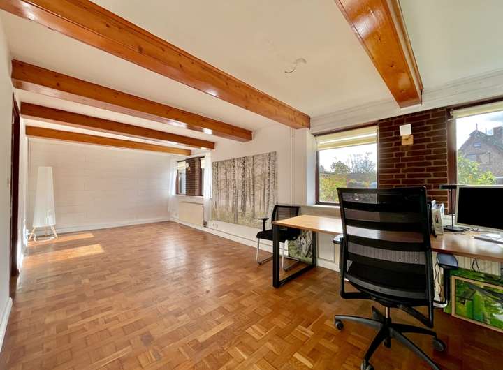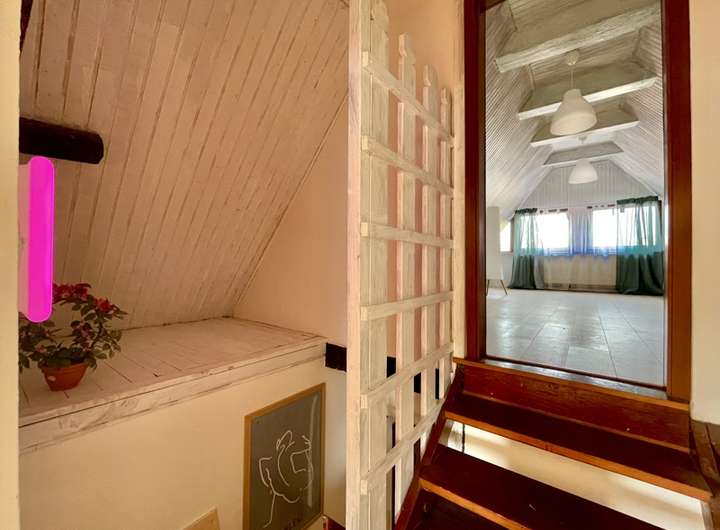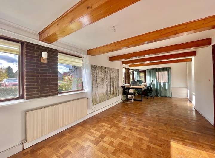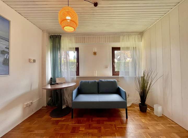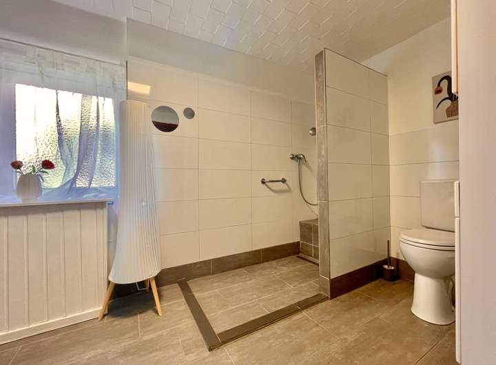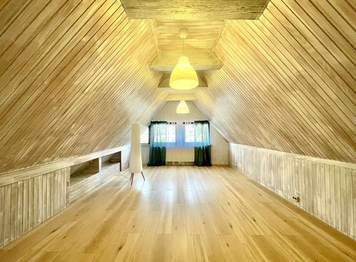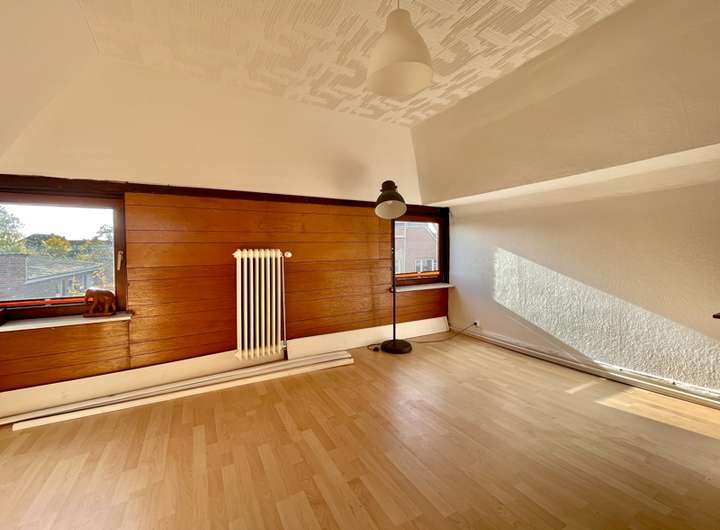 Das Haus verfügt über mehrere flexibel nutzbare Räume, ein modernes Badezimmer mit bodengleicher Dusche sowie ein großzügiges, lichtdurchflutetes Wohnzimmer mit Parkettfußboden. Im Dachgeschoss stehen zwei weitere Räume mit sichtbaren Balken und Dachschrägen zur vielseitigen Nutzung bereit.