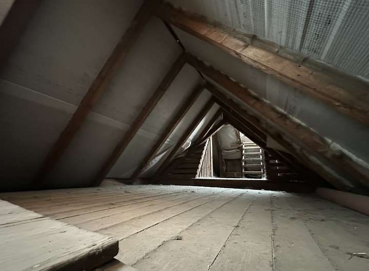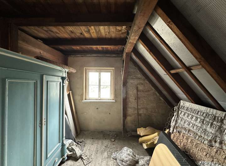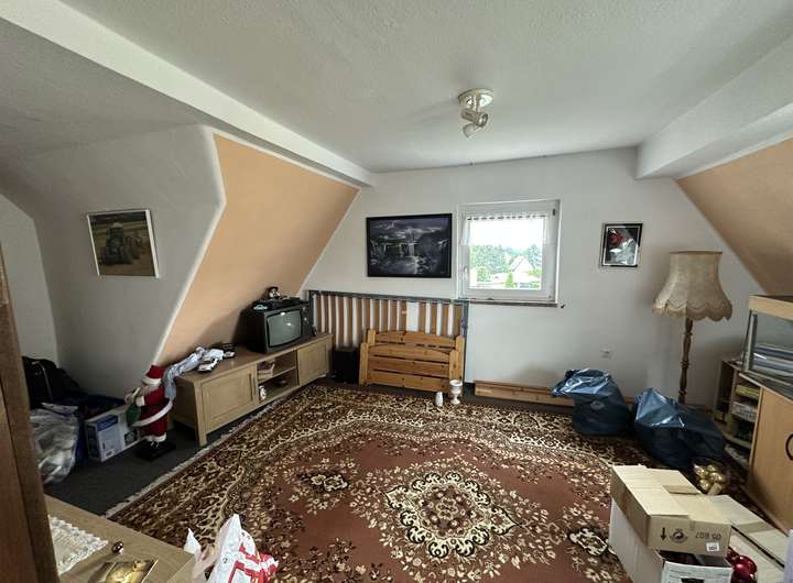 Das teilausgebaute Dachgeschoss beherbergt ein weiteres Zimmer mit kleinem WC-Bereich. Die andere Hälfte des Dachgeschosses dient derzeit als Lagerfläche und bietet Ausbaureserve für zusätzlichen Wohnraum.