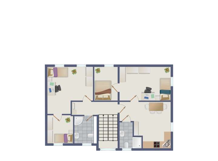 Im Obergeschoss lassen sich zwei separate Kinderbereiche mit jeweils eigenem Bad realisieren oder alternativ eine abgetrennte Einliegerwohnung – etwa für Großeltern. Ein großes Arbeitszimmer oder Homeoffice-Bereich ist ebenfalls denkbar.