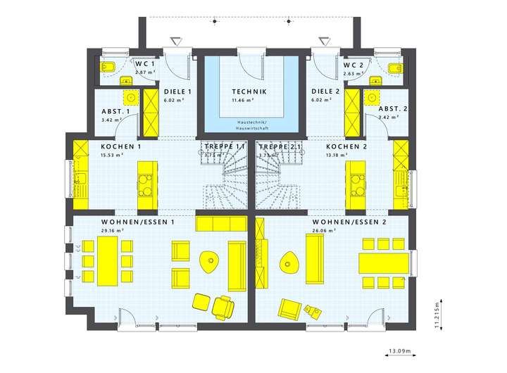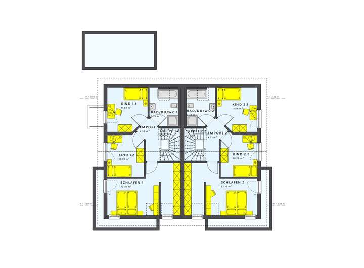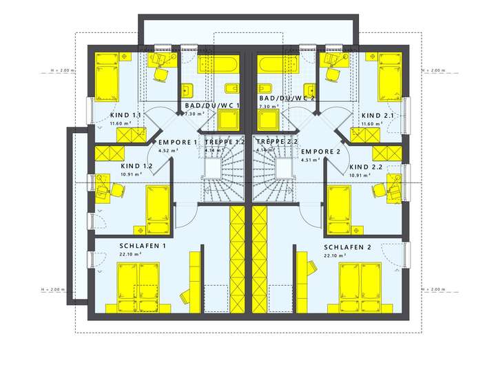 Das besondere Konzept ermöglicht es, zwei separate Wohneinheiten zu schaffen: Jede Einheit umfasst einen Wohn- und Essbereich, eine moderne Küche, ein Bad und ein gemütliches Schlafzimmer.