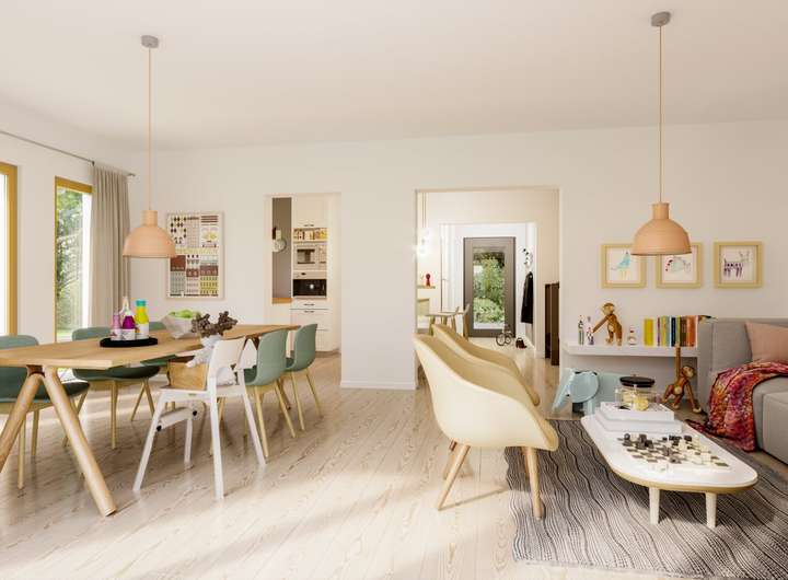 Dein neues Zuhause bietet dir eine durchdachte und hochwertige Ausstattung, die keine Wünsche offenlässt. Zu den Highlights gehören moderne Böden, edle Türen und stilvolle Sanitäranlagen, die bereits im Zuhause-Paket enthalten sind. Du hast die Möglichkeit, deine individuelle Traumküche auswählen, die perfekt auf deinen Grundriss abgestimmt wird sowie innovative Stauraumlösungen bietet.
